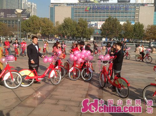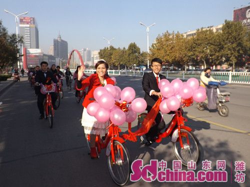 濰坊公共自行車試運(yùn)行以來,得到了市民的認(rèn)可和喜愛。記者在濰坊市公共自行車管理處了解到,用公共自行車來代替“婚車”在濰坊并不是第一例了,這樣的婚禮不僅低碳環(huán)保,又浪漫時尚?;槎Y中的公共自行車是濰坊公共自行車管理處在了解了他們的情況之后免費(fèi)提供的,新郎表示十分的感謝,并呼吁更多的市民加入到低碳出行的隊伍中來。