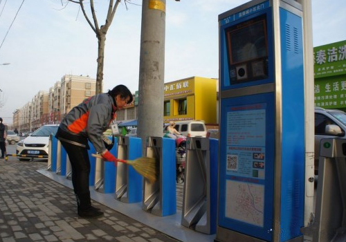 存放了一整夜的“小綠”,車身上早已蒙上一層灰塵,李莉打開車筐,將抹布在水桶中清洗干凈,來回認真擦拭著自行車車身和鎖車器,尤其是市民直接接觸到的刷卡區(qū)位置。隨后她拿起小笤帚掃落掉鎖車器卡口內(nèi)側(cè)的灰塵,打掃下周邊地面衛(wèi)生。立春后的清早,空氣中還滲透著絲絲寒意,記者此時的手腳已漸冰涼,但李莉的身影,卻一直忙碌在站點前。