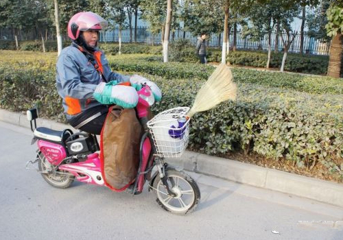 清晨6時50分,夜色還未褪去,一輛小型電動車緩緩駛向阜師院新校區(qū)公共自行車站點,騎車的人是阜陽市公共自行車管理中心的巡檢員李莉,今年38歲。她的主要工作,是每天奔波于雙清路、二道河路、清河西路三條路段14個站點,因此電動車成了她最快捷的交通工具,車筐里還放置著一塊抹布、一罐水桶和一把小笤帚?!把矙z員的工作就是每天檢查站點的車輛、設備和保潔,并配合完成調(diào)度工作”。與記者簡單地認識后,李莉開始了一天的工作。