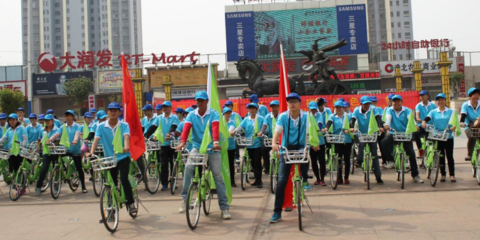淮北分公司組織舉辦了千人騎行活動(dòng)。綠色的公共自行車,配上寫有環(huán)保標(biāo)語(yǔ)的小旗幟,再加上綠色的領(lǐng)隊(duì)旗,現(xiàn)場(chǎng)的場(chǎng)景頗為壯觀。