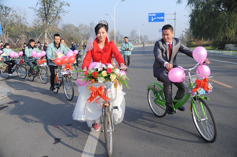 平日里他們就崇尚低碳環(huán)保,當(dāng)公共自行車在徐州市驚艷亮相后,他們便決定用那抹象征生命的蘋果綠和象征熱情的橙紅來見證他們的愛情。