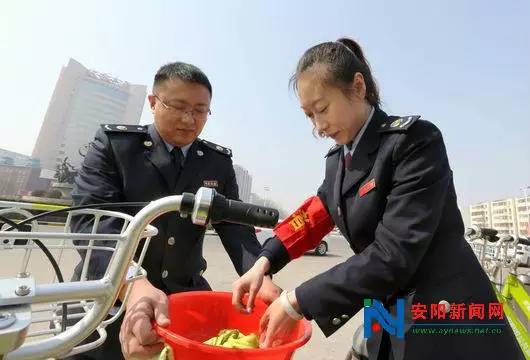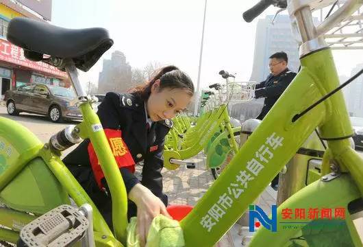 2016年3月1日,安陽(yáng)市高新區(qū)七仙女轉(zhuǎn)盤公共自行車租賃站點(diǎn),高新區(qū)國(guó)稅局的青年志愿者正在為20輛綠色環(huán)保的公共自行車進(jìn)行保潔。