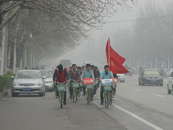 由于近一年中霧霾天氣頻繁出現(xiàn),環(huán)境污染比較嚴(yán)重,這也是近期兩會(huì)的熱點(diǎn)話題,中國(guó)礦業(yè)大學(xué)徐海學(xué)院建工系建環(huán)12-1團(tuán)支部為了積極的學(xué)習(xí)兩會(huì)精神,舉行了騎公共自行車宣傳“保護(hù)環(huán)境,綠色出行”的活動(dòng),提高人們保護(hù)環(huán)境的意識(shí),鼓勵(lì)人們多騎自行車少開(kāi)汽車,最終達(dá)到減少環(huán)境污染的目的。